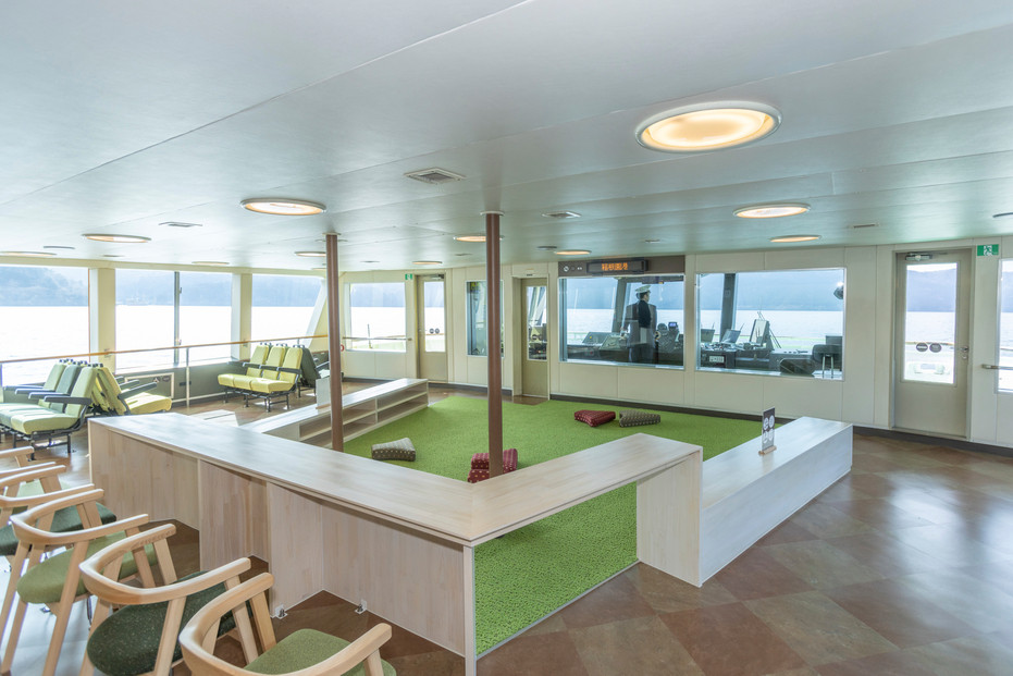 船内は自由席です、座る場所により楽しみ方が違ってきます、1階前方のお席では大きな窓からコクピットのキャプテンの操作がすべてわかり、気分はキャプテンに…。
